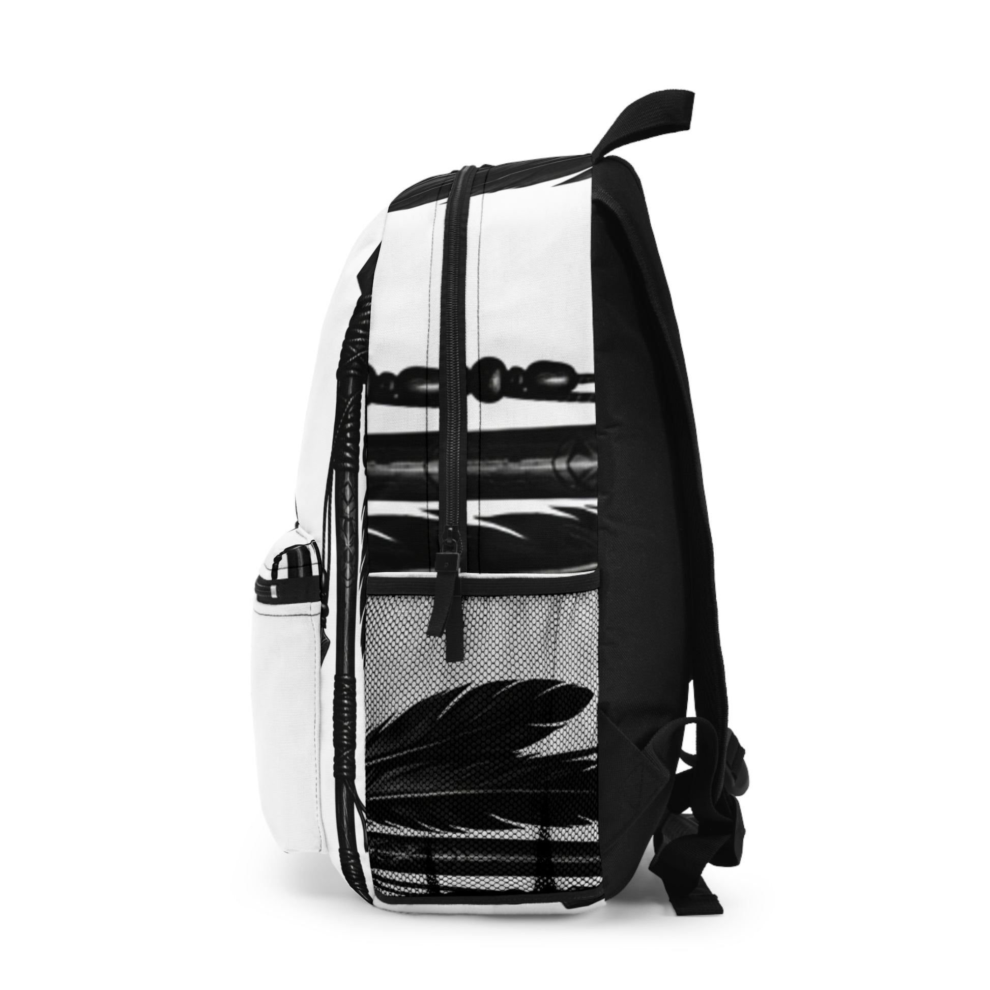 Sleek backpack featuring bold black Native American arrow motifs on a crisp white background, rendered in striking digital art. Lightweight yet durable with roomy storage, smooth zippers, and comfy straps for school, travel, or daily carry.