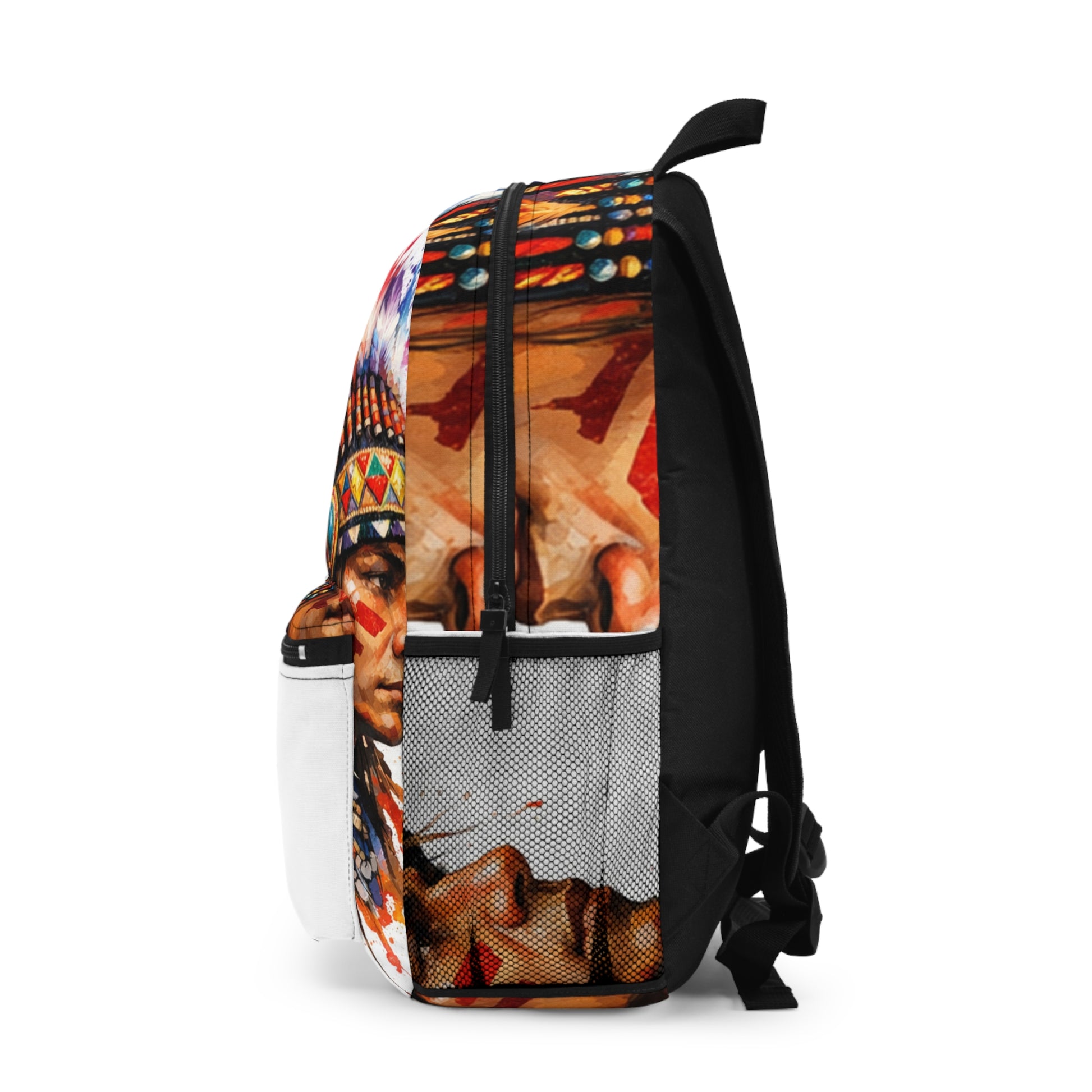 Stand out with this vibrant backpack featuring a colorful Native American headdress in rainbow hues, splash art accents, and crisp digital design on a clean white background. Lightweight, durable, and perfect for school, travel, and everyday carry.