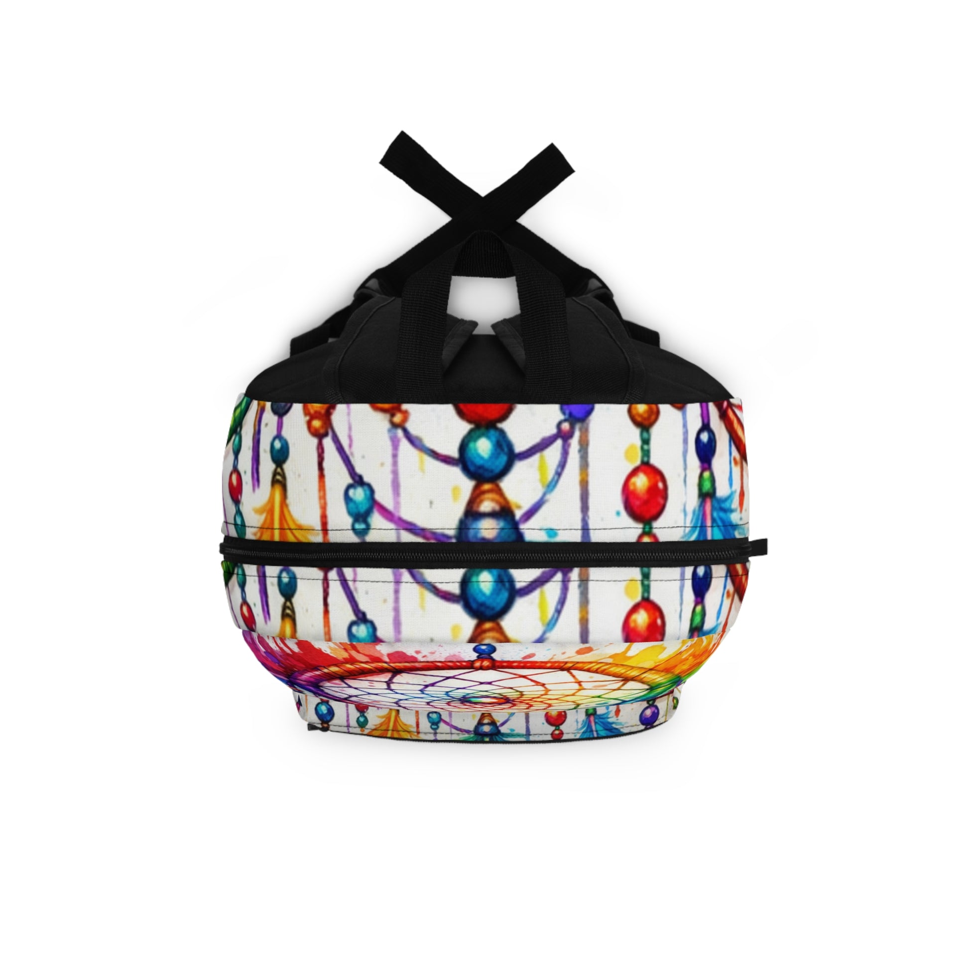 Stand out with this vibrant backpack featuring a colorful Native American dream catcher in rainbow splash art on a crisp white background. Bold digital art details bring modern energy and cultural-inspired style, perfect for school, travel, or everyday adventures.