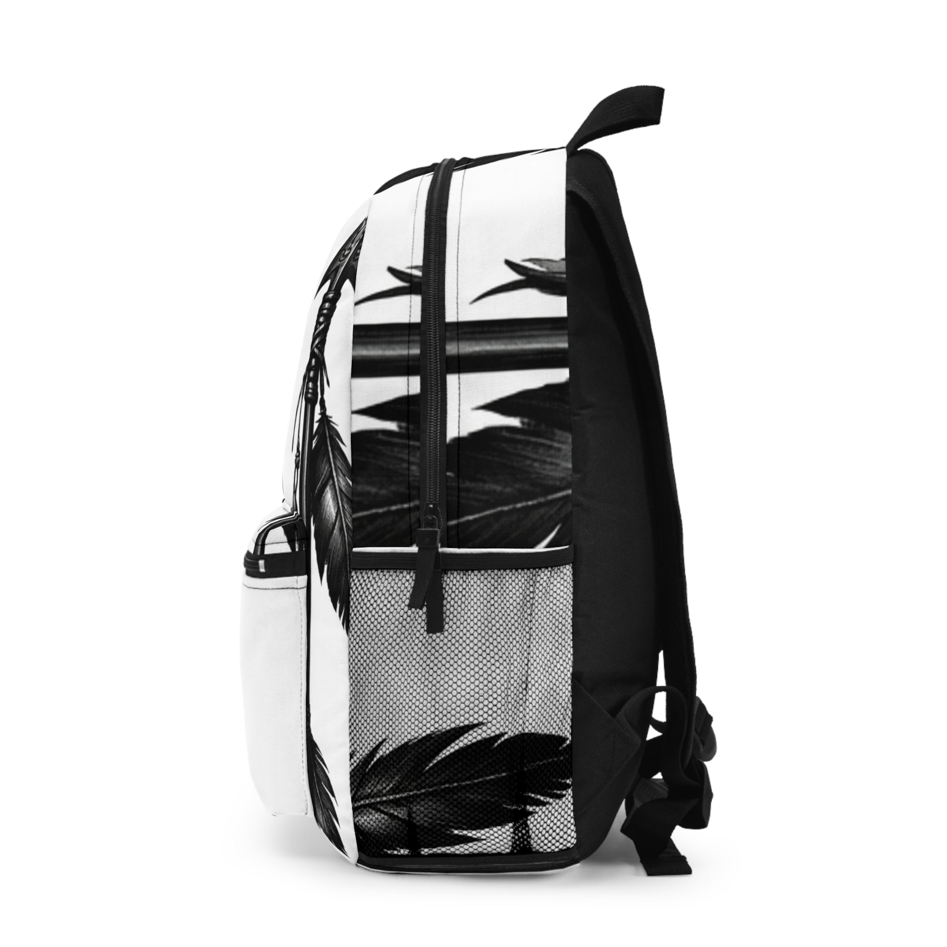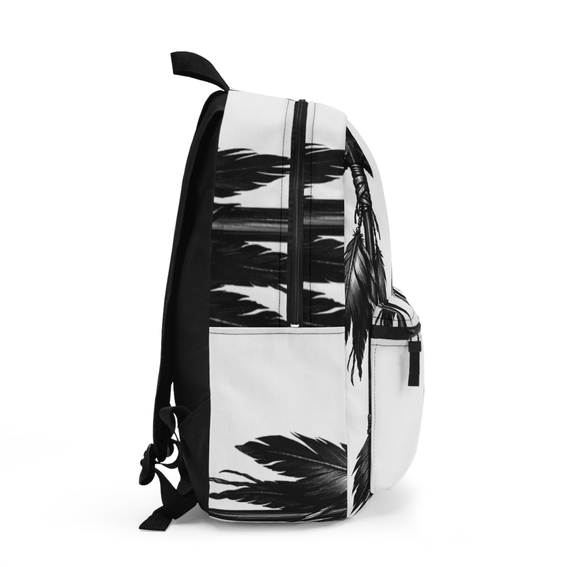 Sleek backpack featuring bold Black Native American arrow motifs on a crisp white background, rendered in striking digital art. Durable, lightweight, and roomy for school, travel, or everyday carry, with comfy straps and smooth zips for all-day style and function.