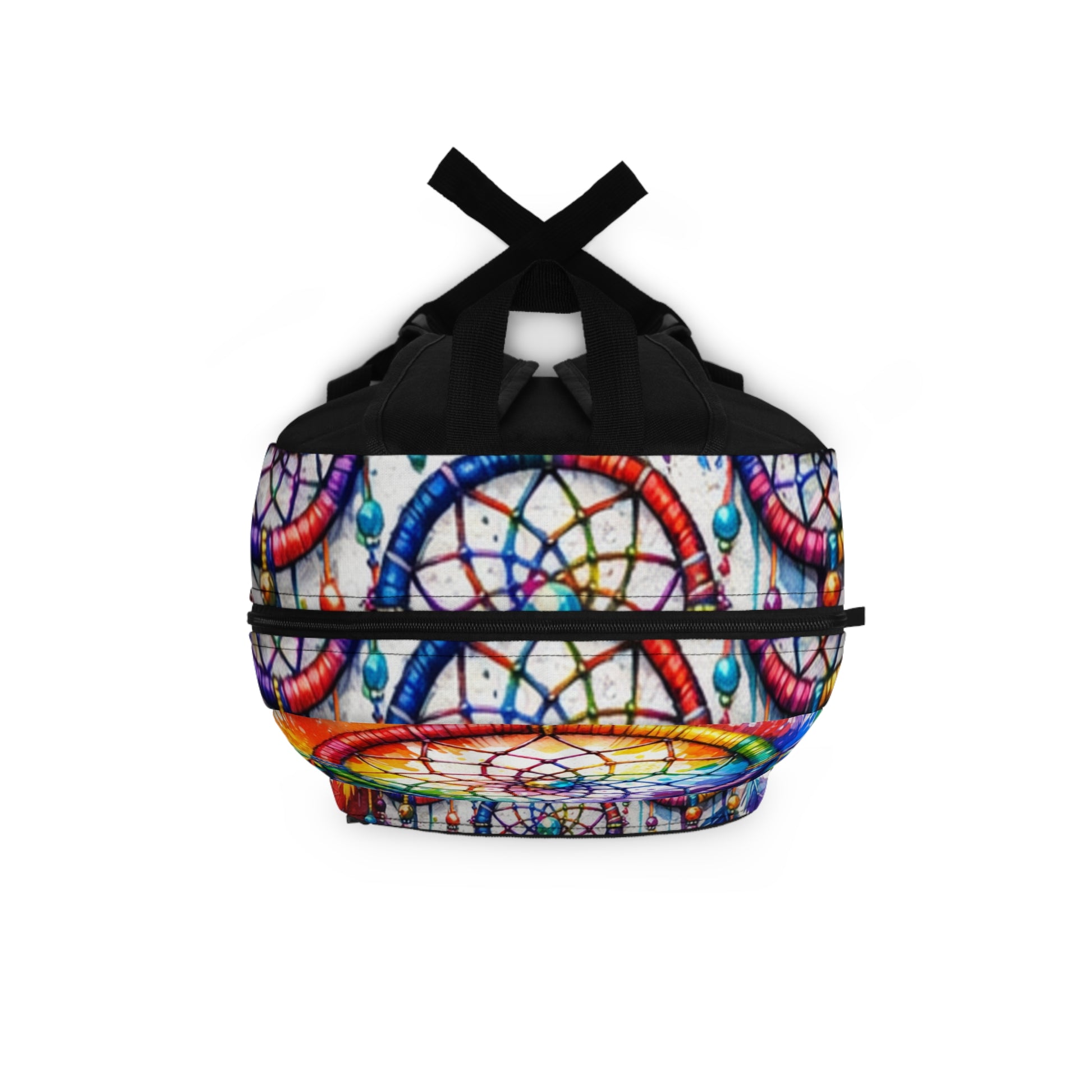 Carry bold spirit on the go with this backpack featuring a colorful Native American dream catcher in rainbow splash art on a crisp white background. Vibrant digital design adds energy while keeping your essentials organized for school, travel, and everyday adventures.