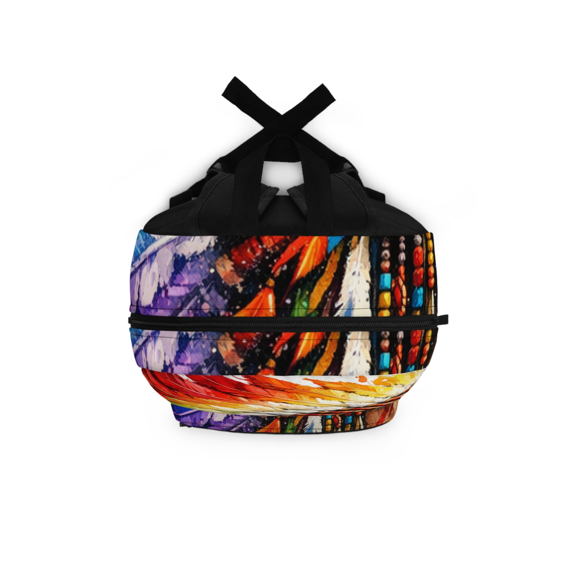 Stand out with this bold backpack featuring a colorful Native American headdress in rainbow splash art on a clean white background. Vivid digital design adds energy and style, while roomy storage keeps your essentials organized for school, travel, and everyday adventures.