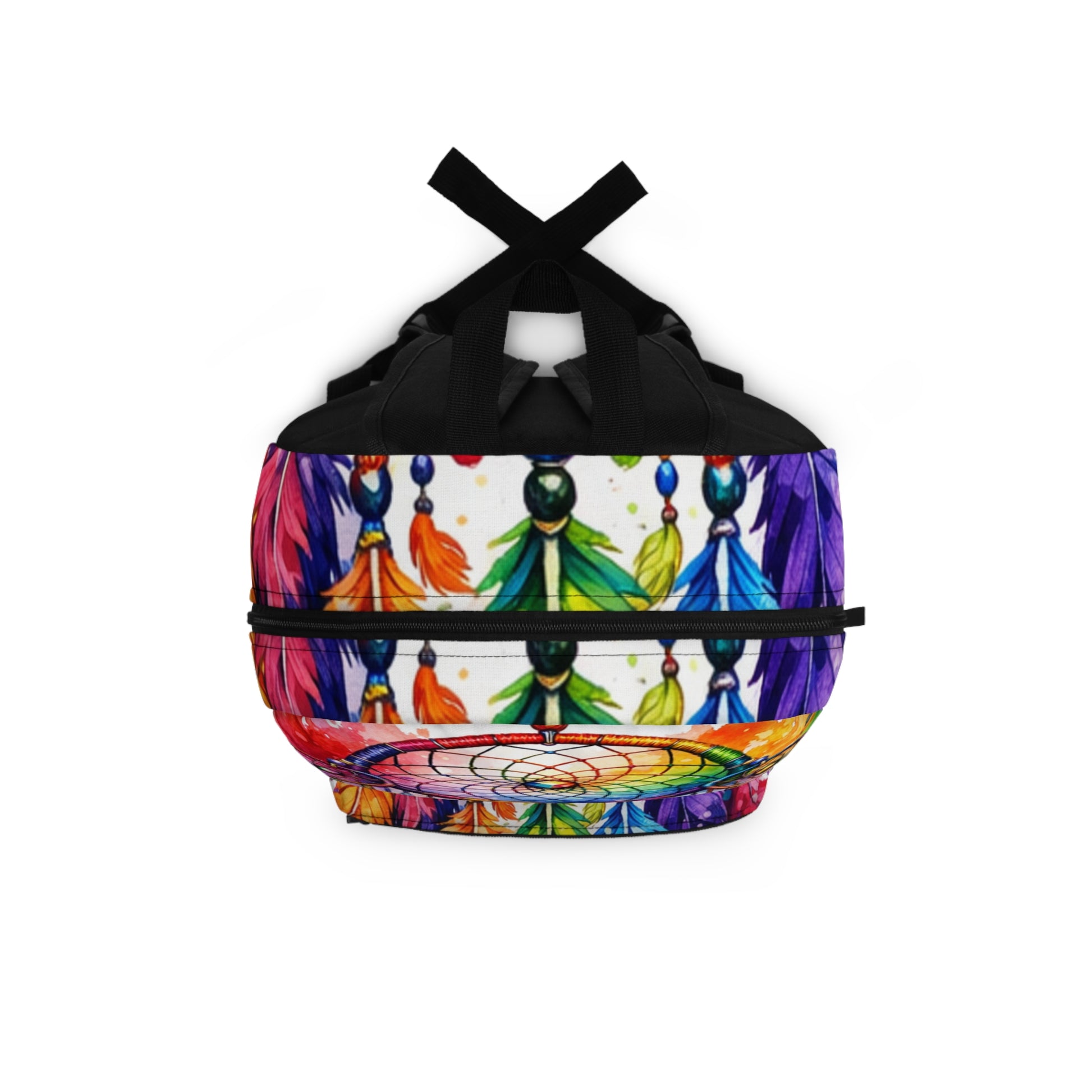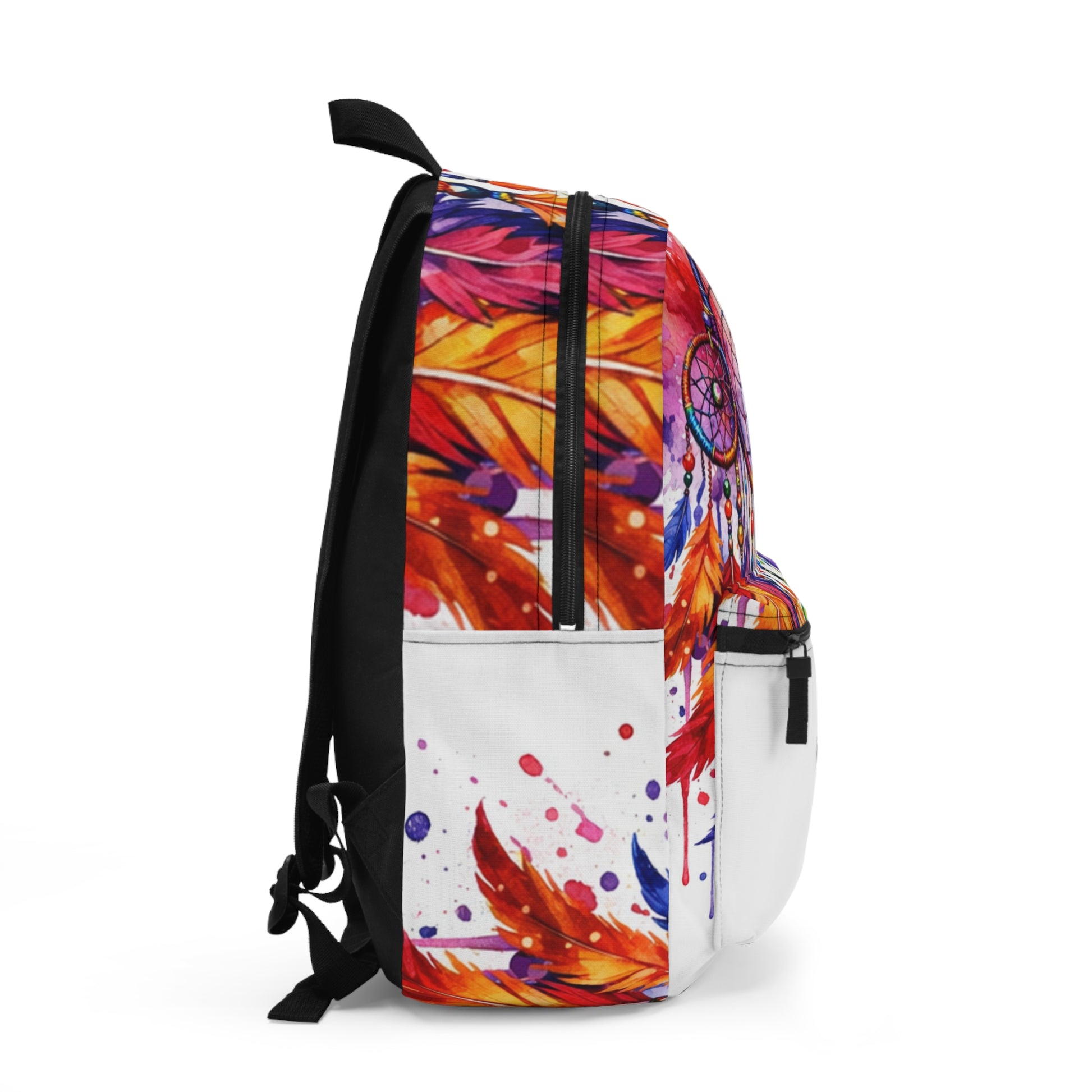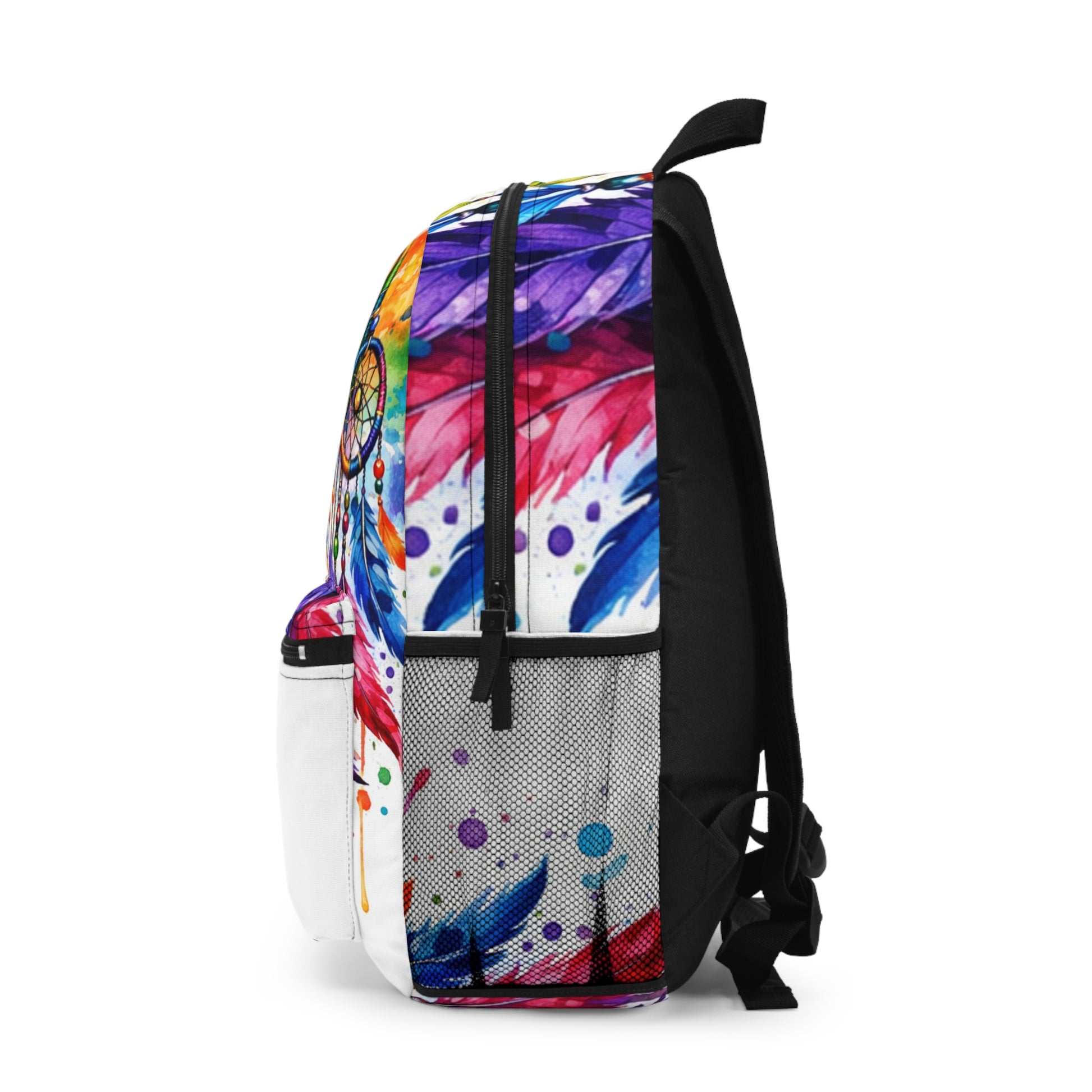 Stand out with this backpack featuring a colorful Native American dream catcher in rainbow splash art on a crisp white background. Bold digital art details bring vibrant energy while keeping your everyday carry stylish, light, and ready for school, travel, or festivals.