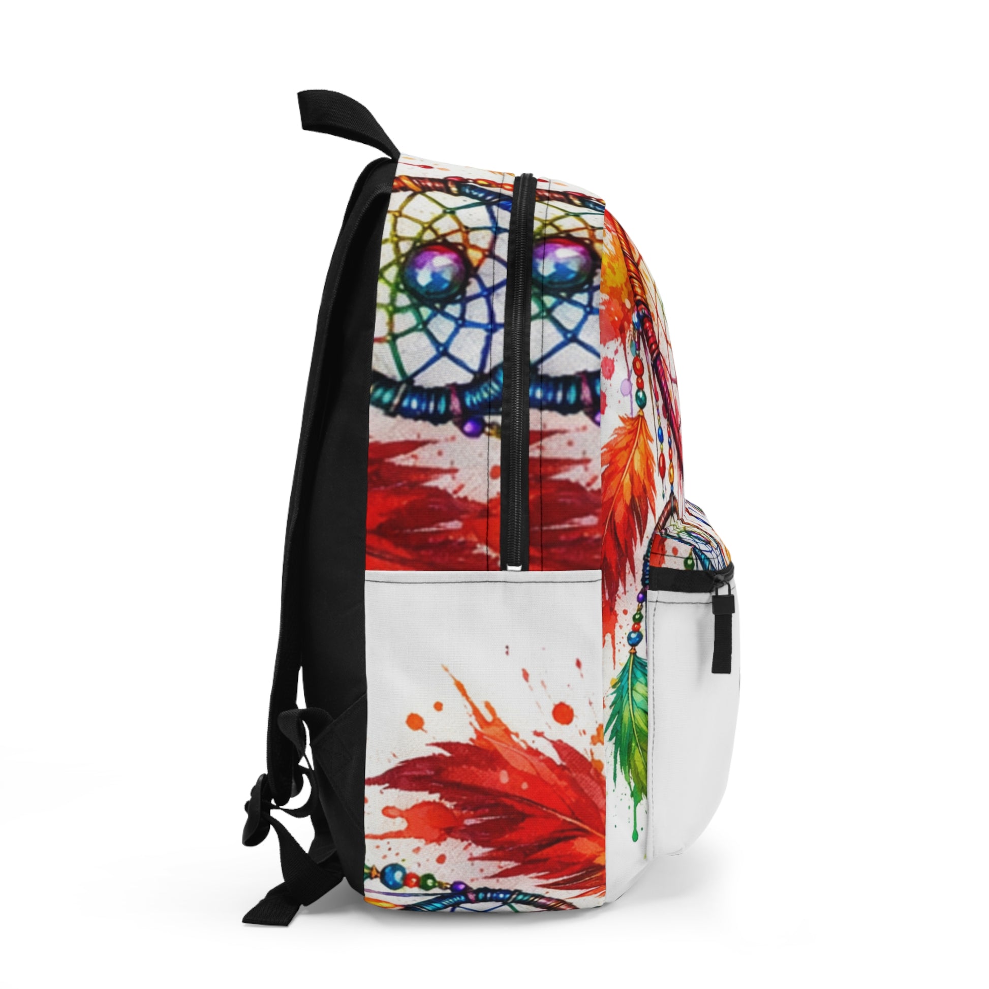 Carry color and spirit with this dreamy backpack featuring a colorful Native American dream catcher in rainbow splash art on a clean white background. Crisp digital art details make it a bold everyday statement for school, travel, and festivals.