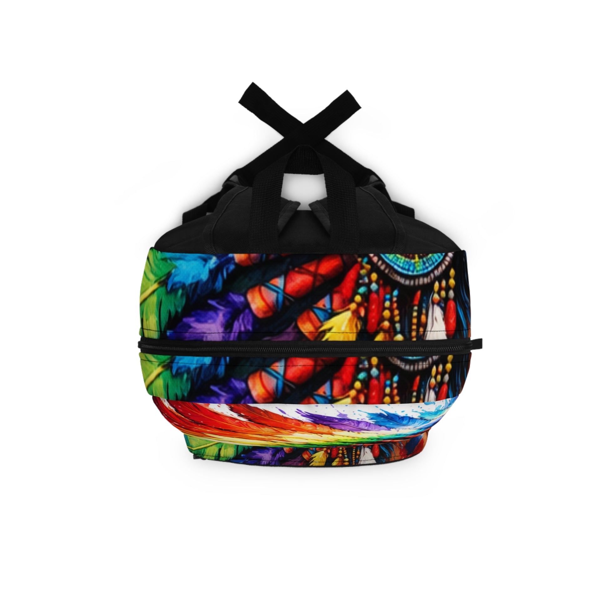 Stand out with this vibrant backpack featuring a colorful Native American headdress in rainbow splash art on a clean white background. Crisp digital art designs deliver bold style, eye-catching detail, and everyday functionality for school, travel, and festivals.