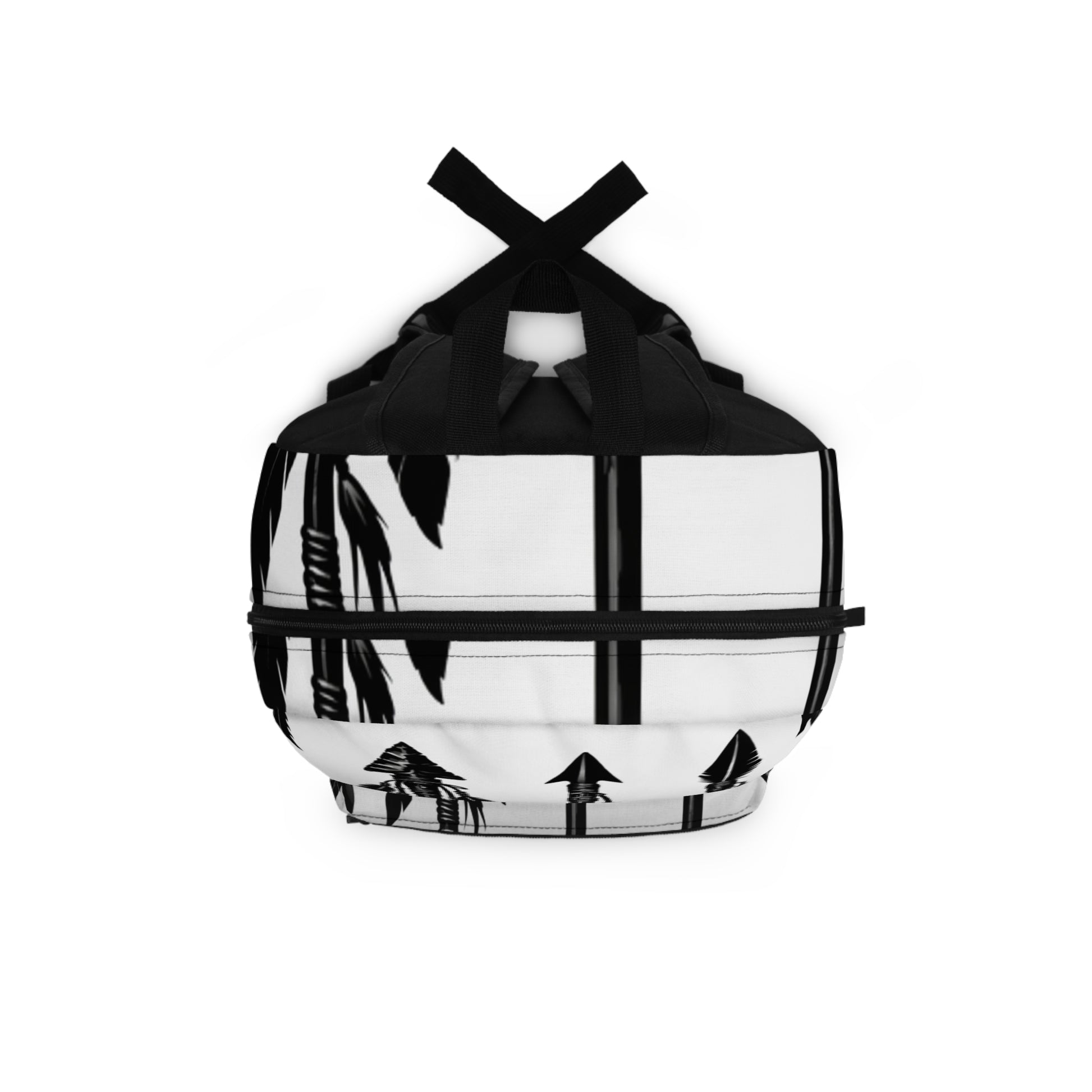 Stand out with this sleek backpack featuring black Native American arrow motifs on a crisp white background in bold digital art style. Durable, lightweight, and roomy for everyday essentials, it is perfect for school, travel, and streetwear looks.