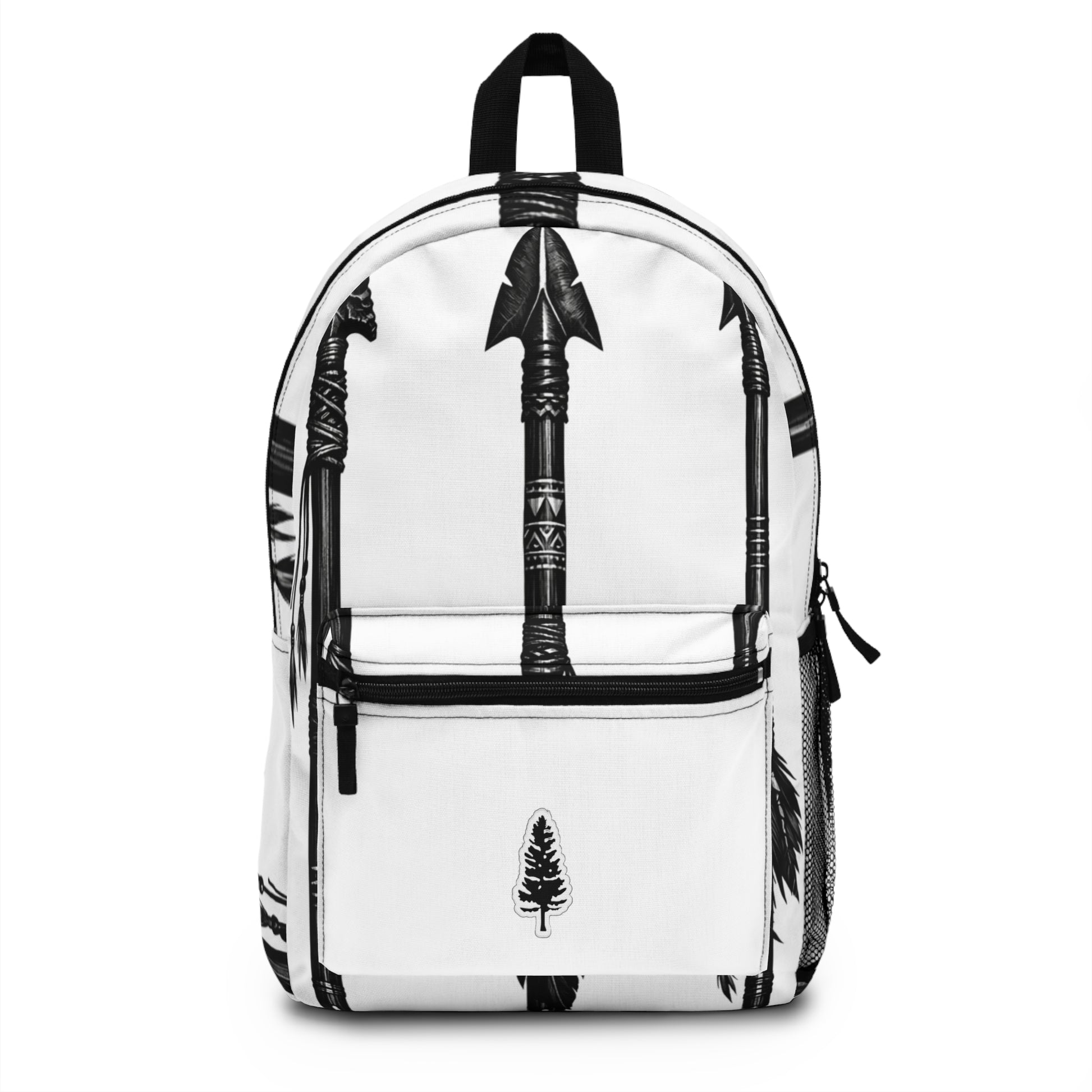 Stand out with this sleek backpack featuring bold black Native American arrow motifs on a crisp white background. The digital art design delivers modern edge with cultural-inspired geometry, while the roomy interior and comfortable straps keep you ready for school, travel, and daily carry.