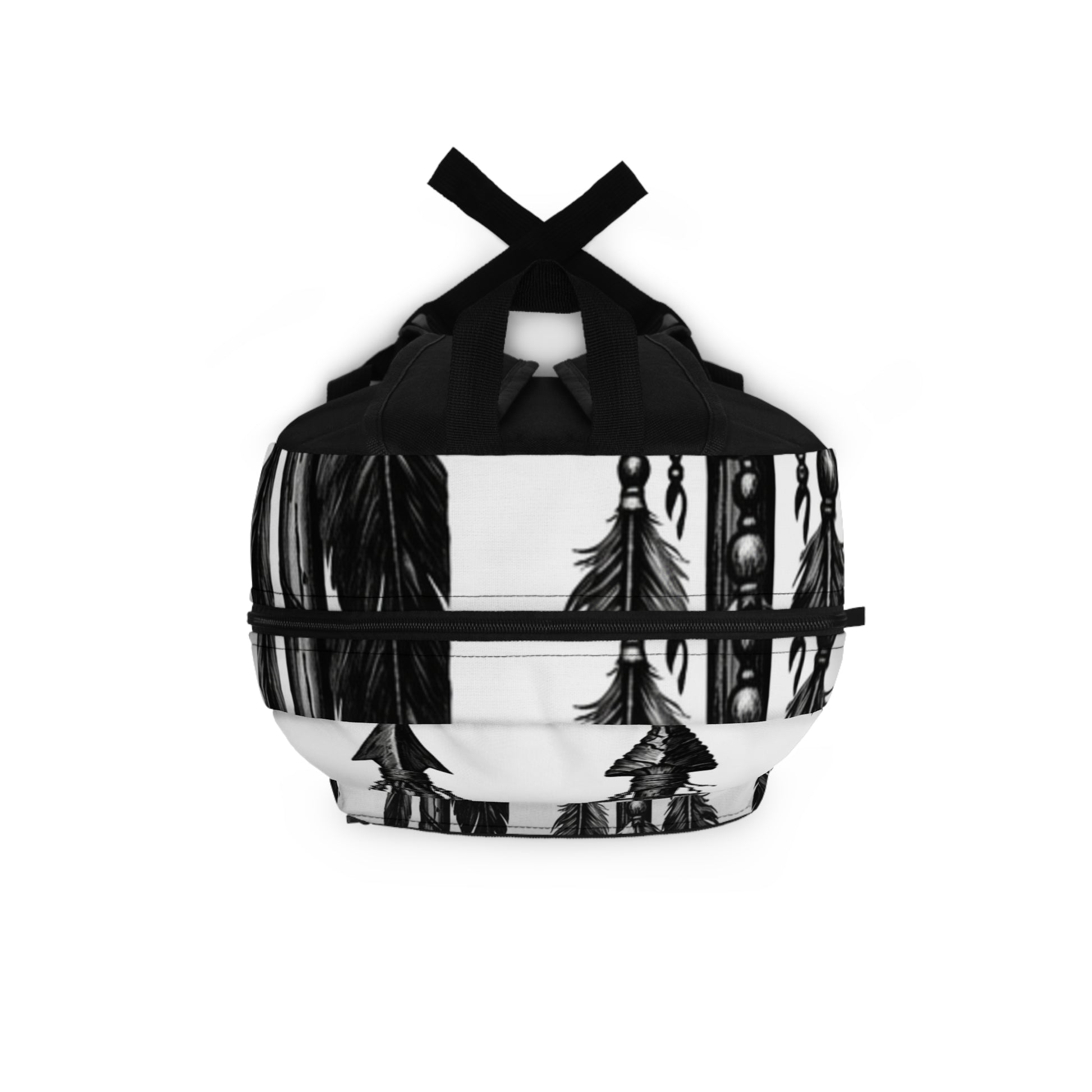 Make a statement with this backpack featuring bold Black Native American arrow motifs on a crisp white background in striking digital art style. Lightweight, durable, and ready for school, travel, or everyday carry with easy-access storage and comfortable straps.